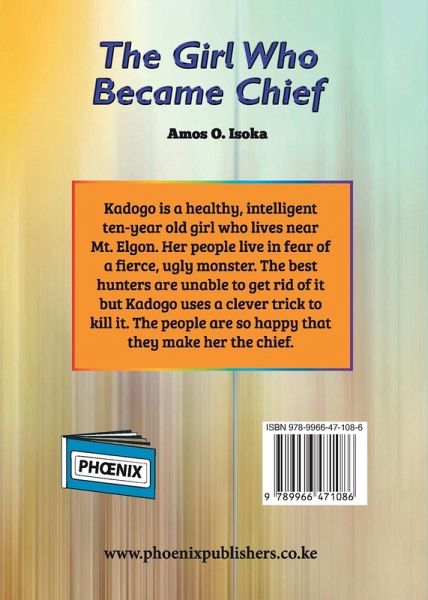 Isoka Kadogo is a healthy, intelligent ten-year-old girl who lives near Mt. Elgon. Her people live in fear of a fierce, ugly monster. The best hunters are unable to get rid of it but Kadogo uses a clever trick to kill it. The people are so happy that they make her the chief.