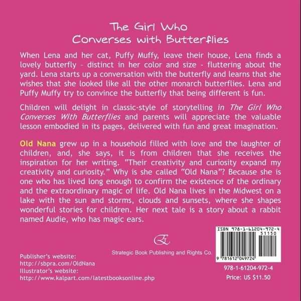 When Lena and her cat, Puffy Muffy, leave their house, Lena finds a lovely butterfly - distinct in her color and size - fluttering about the yard. Lena starts up a conversation with the butterfly and learns that she wishes that she looked like all the other monarch butterflies. Lena and Puffy Muffy try to convince the butterfly that being different is fun. Children will delight in classic-style of storytelling in The Girl Who Converses With Butterflies and parents will appreciate the valuable lesson embodied in its pages, delivered with fun and great imagination. Old Nana grew up in a household filled with love and the laughter of children, and, she says, it is from children that she receives the inspiration for her writing. "Their creativity and curiosity expand my creativity and curiosity." Why is she called "Old Nana"? Because she is one who has lived long enough to confirm the existence of the ordinary and the extraordinary magic of life. Old Nana lives in the Midwest on a lake with the sun and storms, clouds and sunsets, where she shapes wonderful stories for children. Her next tale is a story about a rabbit named Audie, who has magic ears. Publisher's website: http://sbpra.com/OldNana