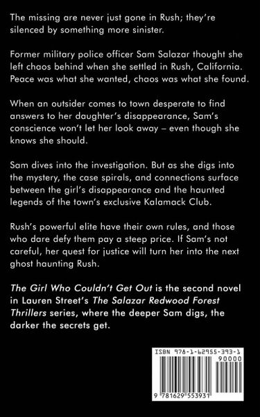 The missing are never just gone in Rush; they're silenced by something more sinister. Former military police officer Sam Salazar thought she left chaos behind when she settled in Rush, California. Peace was what she wanted, chaos was what she found. When an outsider comes to town desperate to find answers to her daughter's disappearance, Sam's conscience won't let her look away - even though she knows she should. Sam dives into the investigation. But as she digs into the mystery, the case spirals, and connections surface between the girl's disappearance and the haunted legends of the town's exclusive Kalamack Club. Rush's powerful elite have their own rules, and those who dare defy them pay a steep price. If Sam's not careful, her quest for justice will turn her into the next ghost haunting Rush. The Girl Who Couldn't Get Out is the second novel in Lauren Street's The Salazar Redwood Forest Thrillers series, where the deeper Sam digs, the darker the secrets get.