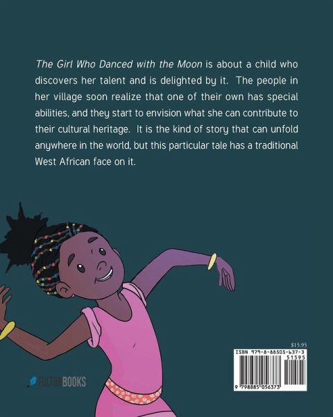 The Girl Who Danced with the Moon is about a child who discovers her talent and is delighted by it. The people in her village soon realize that one of their own has special abilities, and they start to envision what she can contribute to their cultural heritage. It is the kind of story that can unfold anywhere in the world, but this particular tale has a traditional West African face on it.