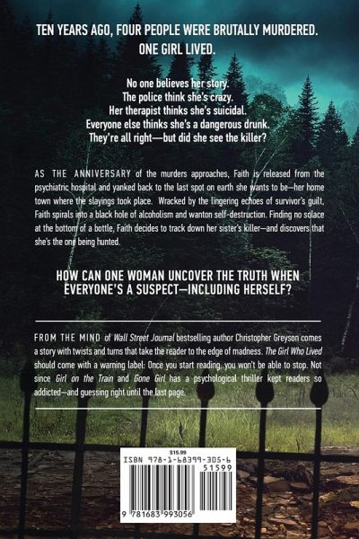 Ten years ago, four people were brutally murdered. One girl lived. No one believes her story. The police think she's crazy. Her therapist thinks she's suicidal. Everyone else thinks she's a dangerous drunk. They're all right—but did she see the killer? As the anniversary of the murders approaches, Faith Winters is released from the psychiatric hospital and yanked back to the last spot on earth she wants to be—her hometown where the slayings took place. Wracked by the lingering echoes of survivor's guilt, Faith spirals into a black hole of alcoholism and wanton self-destruction. Finding no solace at the bottom of a bottle, Faith decides to track down her sister's killer—and then discovers that she's the one being hunted. How can one woman uncover the truth when everyone's a suspect—including herself? From the mind of Wall Street Journal bestselling author Christopher Greyson comes a story with twists and turns that take the reader to the edge of madness. The Girl Who Lived should come with a warning label: once you start reading, you won't be able to stop. Not since Girl on the Train and Gone Girl has a psychological thriller kept readers so addicted—and guessing right until the last page. Praise for Christopher Greyson's The Girl Who Lived Gold Medal Winner for Best Mystery/Thriller ebook of the Year — 2018 Independent Publisher Book Awards Winner Best Thriller — 2018 National Indie Excellence Awards Voted Most Loved Cover — NetGalley Readers Grab your copy of this highly-acclaimed thriller today! "Greyson is a master of weaving suspense and keeping the reader guessing..." — NetGalley Review "The plot turns come fast and furious... Sharp characters enmeshed in a mystery that, particularly in its final lap, is a gleefully dizzy ride." — Kirkus Reviews "Christopher Greyson has created a thriller on par with The Girl on the Train, only with more suspects, more danger, and more agony for the young heroine." — Killer Nashville Christopher Greyson's novel weaves a tale full of mystery, action and suspense with laugh-out-loud humor and sizzling romance. His unique stories and no-nonsense style of writing will take you on a page-turning roller coaster ride of emotions right up until the very end. Please visit Christopher Greyson's website to find out more about your favorite characters, giveaways, and updates on new book releases.