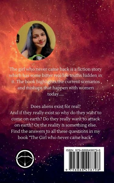 The girl who never came back is a fiction story which has some bitter real life truths hidden in it. The book highlights the current scenarios and mishaps that happen with women today..... Does aliens exist for real? And if they really exist so why do they want to come on earth? Do they really want to attack on earth? Or the reality is something else. Find the answers to all these questions in my book ""The Girl who never came back"".