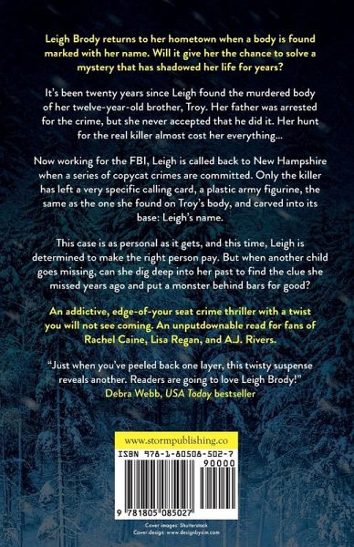 Leigh Brody returns to her hometown when a body is found marked with her name. Will it give her the chance to solve a mystery that has shadowed her life for years? It's been twenty years since Leigh found the murdered body of her twelve-year-old brother, Troy. Her father was arrested for the crime, but she never accepted that he did it. Her hunt for the real killer almost cost her everything... Now working for the FBI, Leigh is called back to New Hampshire when a series of copycat crimes are committed. Only the killer has left a very specific calling card, a plastic army figurine, the same as the one she found on Troy's body, and carved into its base: Leigh's name. This case is as personal as it gets, and this time, Leigh is determined to make the right person pay. But when another child goes missing, can she dig deep into her past to find the clue she missed years ago and put a monster behind bars for good? An addictive, edge-of-your seat crime thriller with a twist you will not see coming. An unputdownable read for fans of Rachel Caine, Lisa Regan, and A.J. Rivers.