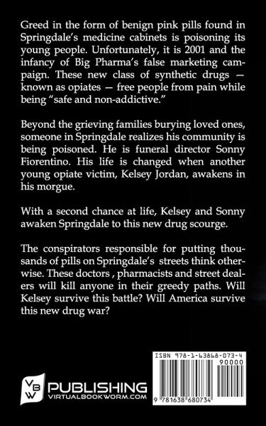 Greed in the form of benign pink pills found in Springdale's medicine cabinets is poisoning its young people. Unfortunately, it is 2001 and the infancy of Big Pharma's false marketing campaign. These new class of synthetic drugs - known as opiates - free people from pain while being "safe and non-addictive." Beyond the grieving families burying loved ones, someone in Springdale realizes his community is being poisoned. He is funeral director Sonny Fiorentino. His life is changed when another young opiate victim, Kelsey Jordan, awakens in his morgue. With a second chance at life, Kelsey and Sonny awaken Springdale to this new drug scourge. The conspirators responsible for putting thousands of pills on Springdale's streets think otherwise. These doctors , pharmacists and street dealers will kill anyone in their greedy paths. Will Kelsey survive this battle? Will America survive this new drug war?