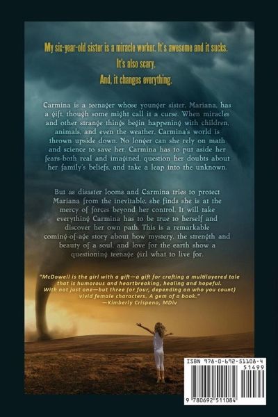 Carmina is a teenager whose younger sister, Mariana, has a gift, though some might call it a curse. When miracles and other strange things begin happening with children, animals, and even the weather, Carmina's world is thrown upside down. No longer can she rely on math and science to save her. Carmina has to put aside her fears-both real and imagined, question her doubts about her family's beliefs, and take a leap into the unknown. But as disaster looms and Carmina tries to protect Mariana from the inevitable, she finds she is at the mercy of forces beyond her control. It will take everything Carmina has to be true to herself and discover her own path. This is a remarkable coming-of-age story about how mystery, the strength and beauty of a soul, and love for the earth show a questioning teenage girl what to live for.