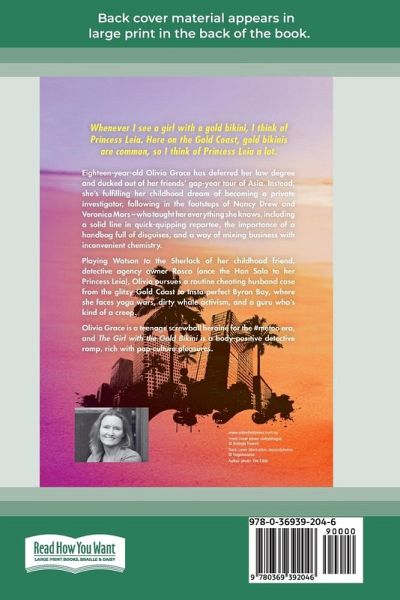 Whenever I see a girl with a gold bikini, I think of Princess Leia. Here on the Gold Coast, gold bikinis are common, so I think of Princess Leia a lot. Eighteen-year-old Olivia Grace has deferred her law degree and ducked out of her friends' gap-year tour of Asia. Instead, she's fulfilling her childhood dream of becoming a private investigator, following in the footsteps of Nancy Drew and Veronica Mars - who taught her everything she knows, including a solid line in quick-quipping repartee, the importance of a handbag full of disguises, and a way of mixing business with inconvenient chemistry. Playing Watson to the Sherlock of her childhood friend, detective agency owner Rosco (once the Han Solo to her Princess Leia), Olivia pursues a routine cheating husband case from the glitzy Gold Coast to Insta-perfect Byron Bay, where she faces yoga wars, dirty whale activism, and a guru who's kind of a creep. Olivia Grace is a teenage screwball heroine for the #metoo era, and The Girl with the Gold Bikini is a body-positive detective romp, rich with pop-culture pleasures.