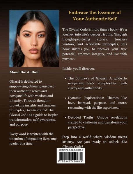 The Givassi Code is a transformative journey into wisdom, self-awareness, and the art of navigating life with purpose. Blending storytelling, decoded insights, and action-based principles, this book unveils hidden truths that challenge conventional thinking. Each passage serves as a key, unlocking a deeper understanding of love, time, distraction, resilience, and authenticity. More than just a book-it's an art piece designed to shift perspectives and inspire profound personal growth. Are you ready to uncover the code?