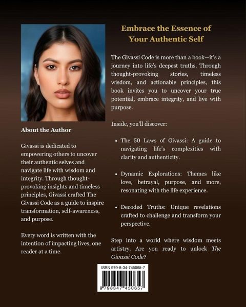 The Givassi Code is a transformative journey into wisdom, self-awareness, and the art of navigating life with purpose. Blending storytelling, decoded insights, and action-based principles, this book unveils hidden truths that challenge conventional thinking. Each passage serves as a key, unlocking a deeper understanding of love, time, distraction, resilience, and authenticity. More than just a book-it's an art piece designed to shift perspectives and inspire profound personal growth. Are you ready to uncover the code?