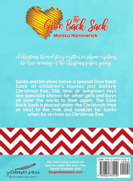 A Christmas themed story written in rhyme explains the true meaning of the Christmas season, giving. Santa and his elves leave a special Give Back Sack at children's houses just before Christmas Eve. Old, new, or outgrown toys are specially chosen for other girls and boys all over the world to love again. The Give Back Sack is placed under the Christmas tree or next to the milk and cookies for Santa when he arrives on Christmas Eve.