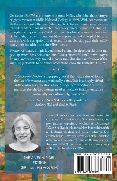 The Given-Up Girl is the story of Bonnie Koller, who joins the country's brightest women at idyllic Halstead College in 1969. With her roommate Hollis as her guide, Bonnie trades her skirts for jeans and her innocence for independence. An unwanted pregnancy forces Bonnie and Hollis to navigate the traps of pre-Roe America - a boyfriend consumed with fear of the draft, doctors of questionable competence, and a hospital bureaucracy rife with corruption. Their search for an abortion puts their ambitions, their friendship and their lives at risk. Twenty years later, Bonnie is determined to find the daughter she bore and gave up when her choices ran out. Now a successful small-town lawyer, Bonnie knows her way around a paper trail. But she doesn't know if the given-up girl wants to be found, or the truth about 1969.