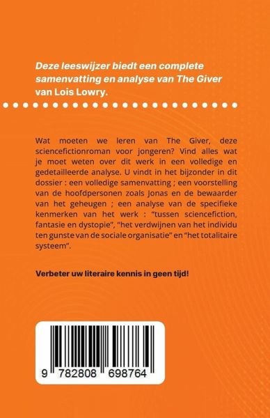 Wat moeten we leren van The Giver, deze sciencefictionroman voor jongeren? Vind alles wat je moet weten over dit werk in een volledige en gedetailleerde analyse. U vindt in het bijzonder in dit dossier : - Een volledige samenvatting - Een voorstelling van de hoofdpersonen zoals Jonas en de bewaarder van het geheugen - Een analyse van de specifieke kenmerken van het werk: tussen sciencefiction, fantasie en dystopie; het verdwijnen van het individu ten gunste van de sociale organisatie; het totalitaire systeem Een referentieanalyse om snel de betekenis van het werk te begrijpen.