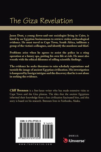 Jason Dent, a young down-and-out sociologist living in Cairo, is hired by an Egyptian businessman to retrieve stolen archaeological evidence. He must travel to Cape Town, South Africa, infiltrate a group of the victim's colleagues, and identify the murderer and thief. He is welcomed by the Orion Society members, who believe he knows more than he does. His mission is complicated by his attraction to the sister of the leading suspect. Problems arise when he agrees to assist the police in a sting operation at a luxury spa, putting is own life at risk. He must also wrestle with the ethical dilemma of selling scientific findings. The evidence he seeks threatens to ruin scholarly reputations and tarnish the image of ancient Egyptian civilization. His investigation is hampered by foreign intrigue and the discovery that he is not alone in seeking the evidence. "A page-turner! The Giza Revelation combines great storytelling with gripping scientific history. Blending archaeology, mystery, and romance, Cliff Brennen may turn out to be our next Robin Cook!" ─Judith Kleinfeld, psychologist and award-winning author. "The Giza Revelation is fast-paced, well-researched, and superbly written. The reader quickly identifies with the protagonist and becomes immersed in the plot. This is a novel the reader will want to share with others." ─Carl Carlan, Col. U.S. Army (Ret.)