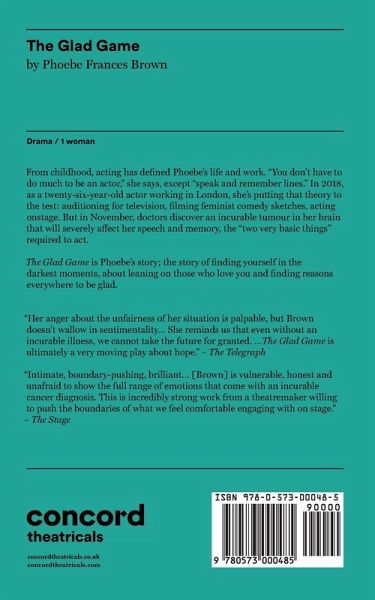 From childhood, acting has defined Phoebe's life and work. "You don't have to do much to be an actor," she says, except "speak and remember lines." In 2018, as a twenty-six-year-old actor working in London, she's putting that theory to the test: auditioning for television, filming feminist comedy sketches, acting onstage. But in November, doctors discover an incurable tumour in her brain that will severely affect her speech and memory, the "two very basic things" required to act. The Glad Game is Phoebe's story; the story of finding yourself in the darkest moments, about leaning on those who love you and finding reasons everywhere to be glad.