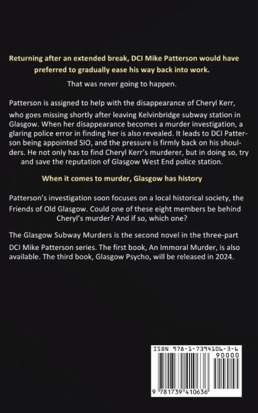 Returning after an extended break, DCI Mike Patterson would have preferred to gradually ease his way back into work. That was never going to happen. Patterson is assigned to help with the disappearance of Cheryl Kerr, who goes missing shortly after leaving Kelvinbridge subway station in Glasgow. When her disappearance becomes a murder investigation, a glaring police error in finding her is also revealed. It leads to DCI Patterson being appointed SIO, and the pressure is firmly back on his shoulders. He not only has to find Cheryl Kerr's murderer but in doing so, try and save the reputation of Glasgow West End police station. When it comes to murder, Glasgow has history Patterson's investigation soon focuses on a local historical society, the Friends of Old Glasgow. Could one of these eight members be behind Cheryl's murder? And if so, which one?
