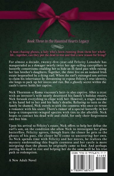 For close to a decade, twenty-five-year-old Felicity Lonsdale has masqueraded as a dowager almost twice her age—selling caterpillars to butterfly consortiums—enabling her to hide an ill-fated past while raising her late brother’s daughters. Together, the three live on an isolated Irish estate bequeathed by a dying earl. When the earl’s estranged son arrives to claim his inheritance by threatening to expose Felicity’s true identity, she longs to pack up her nieces and run. But a ghostly secret within the castle’s turret holds her captive. Nick Thornton—a Roma viscount’s heir—is also captive. After a tryst with an investor’s wife nearly destroyed his family’s holiday resort, Nick forsook everything to elope with her. However, a tragic mistake at his hand led to her and his baby’s deaths. Refusing to turn to the family he shamed, Nick travels to seek the countess who once co-wrote a romance with his sister. There’s rumor of a special butterfly in her keep—a transparent-winged species with ties to the afterlife. Nick hopes to contact his dead wife and child, for only their forgiveness can free him. Upon his arrival to Felicity’s estate, Nick offers to help her defeat the earl’s son, on the condition she allow Nick to investigate her glass butterflies. Felicity agrees, though fears the closer he gets to the ghosts of his past, the closer he’ll come to uncovering her own. As Nick spends time with Felicity and her nieces, he realizes the mystery enshrouding this fragile countess and her castle is more intriguing than the ghosts he originally came to find. And perhaps putting his dead to rest and helping her do the same will be his true path to redemption.