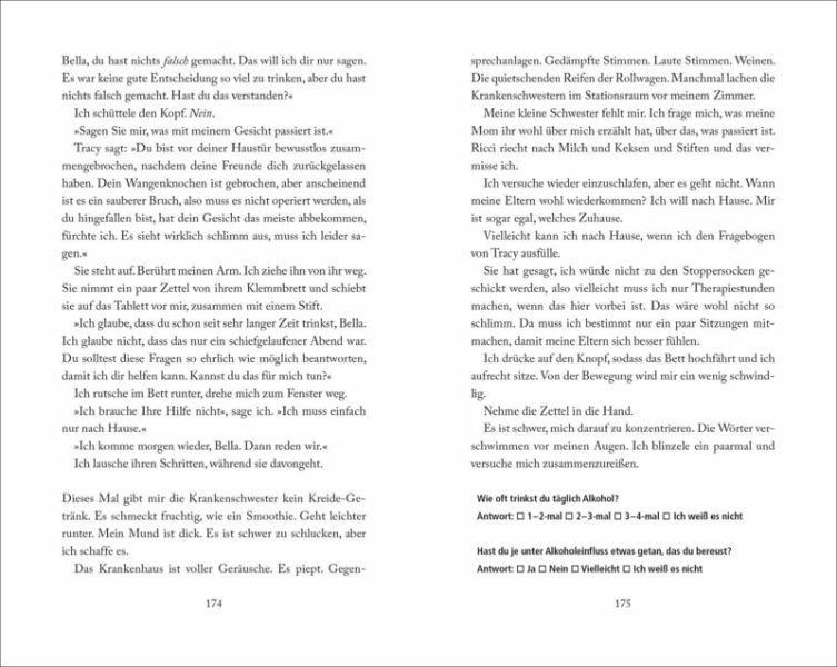 Bella möchte es allen recht machen, vergisst sich dabei aber völlig. Hier geht es auch nicht darum, jemandem die Schuld zuzuweisen. Dieses Buch zeigt auf, wie es laufen kann. Natürlich probiert man sich in dem Alter aus. Man schlägt über die Strenge. Das Suchtrisiko ist groß.