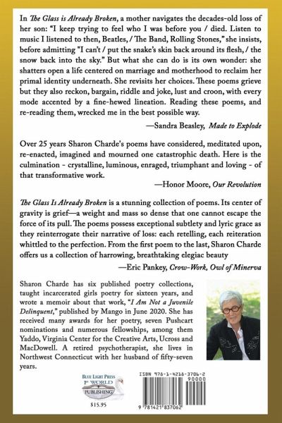 In The Glass is Already Broken, a mother navigates the decades-old loss of her son: "I keep trying to feel who I was before you / died. Listen to music I listened to then, Beatles, / The Band, Rolling Stones," she insists, before admitting "I can't / put the snake's skin back around its flesh, / the snow back into the sky." But what she can do is its own wonder: she shatters open a life centered on marriage and motherhood to reclaim her primal identity underneath. She revisits her choices. These poems grieve but they also reckon, bargain, riddle and joke, lust and croon, with every mode accented by a fine-hewed lineation. Reading these poems, and re-reading them, wrecked me in the best possible way. -Sandra Beasley, author of Made to Explode About the Author Sharon Charde has six published poetry collections, taught incarcerated girls poetry for sixteen years, and wrote a memoir about that work, "I Am Not a Juvenile Delinquent," published by Mango in June 2020. She has received many awards for her poetry, seven Pushcart nominations and numerous fellowships, among them Yaddo, Ucross and MacDowell. A retired psychotherapist, she lives in Northwest Connecticut with her husband of fifty-seven years.