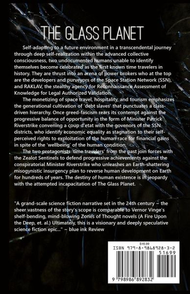 A timely and relevant story of human occupation and subjugation rising up, THE GLASS PLANET is a metaphysical journey into human self-consciousness, and into the collective consciousness of an 'advanced' human civilization. By 2339 to 2352 AD, humankind has irresponsibly short-changed themselves as the destructive forces of greed-fascism exploit our home for its perceived riches at the sacrifice of the 'wellbeing' of the human condition. The battle to preserve the Glass Planet Space Station (GPSS) from Minister Riverstrike and the human forces who seek dominance and wealth over the masses is on the shoulders of the two archaeologist time-travelers from the 20th century who gain celebrity as the first known time-travelers in history. They inspire the Zealot Sentinels, led by Commander Janalake, a trusted advisor to Minister Riverstrike who is the celebrated innovator of the Space Station Network (SSN). Janalake harbors a mysterious past with an affection for the proletariat, and the power of influence rivaling second only to the Minister's. The existence of all civilization of freedom with liberty is dependent on the connectivity of the collective consciousness enabled by the GPl, an embedded interface to the brain's neurological cognitive system enhancing and modifying human behavior by the moral categorical imperative to the "wellbeing" of the human condition. The GPSS is the technological heart that sustains the human population of 22 billion inhabitants from the Earth to the Moon, the SSN in between, and the Martian Metropolis City-State outpost. At stake is the future of the existence of the human race, if the progressive utopian advancements are compromised, forever altering the arc of social justice, then a cataclysm of mass extinctions will occur!