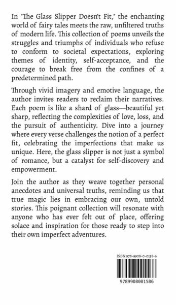 In "The Glass Slipper Doesn't Fit," the enchanting world of fairy tales meets the raw, unfiltered truths of modern life. This collection of poems unveils the struggles and triumphs of individuals who refuse to conform to societal expectations, exploring themes of identity, self-acceptance, and the courage to break free from the confines of a predetermined path. Through vivid imagery and emotive language, the author invites readers to reclaim their narratives. Each poem is like a shard of glass-beautiful yet sharp, reflecting the complexities of love, loss, and the pursuit of authenticity. Dive into a journey where every verse challenges the notion of a perfect fit, celebrating the imperfections that make us unique. Here, the glass slipper is not just a symbol of romance, but a catalyst for self-discovery and empowerment. Join the author as they weave together personal anecdotes and universal truths, reminding us that true magic lies in embracing our own, untold stories. This poignant collection will resonate with anyone who has ever felt out of place, offering solace and inspiration for those ready to step into their own imperfect adventures.