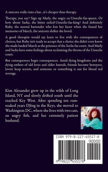 A unicorn walks into a bar...it's cheaper than therapy. Therapy, you say? Sign up Marly, the angry ex-Unseelie-fae-queen. Or how about Sasha, the bitter exiled-Unseelie-fae-king? And definitely Ruby, the mortal bartender who lost her heart when she found her memories of March, the unicorn shifter she loved. A good therapist would say learn to live with the consequences of choices, but Ruby isn't ready to accept that a choice she didn't even know she made landed March as the prisoner of the Seelie fae court. And Marly and Sasha have some feelings about reclaiming the throne of the Unseelie court. But consequences beget consequences. Amid dying kingdoms and the dying embers of old loves and older hatreds, friends become betrayers, lovers keep secrets, and someone or something is out for blood red revenge.
