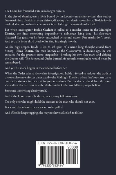 The Loom has fractured. Fate is no longer certain. In the city of Velmire, every life is bound by the Loom-an ancient system that weaves fate-marks into the skin of every citizen, dictating their destiny from birth. To defy fate is unthinkable, and to break a fate-mark is to challenge the natural order itself. But when investigator Isolde Caelum is called to a murder scene in the Midnight District, she finds something impossible-a nobleman lying dead, his fate-mark shattered like glass, yet his body untouched by natural causes. Fate-marks don't break. And yet, this is the third death of its kind in a single month. As she digs deeper, Isolde is led to whispers of a name long thought erased from history-Elias Thorne, the man known as the Glassweaver. A decade ago, he was executed for the greatest crime imaginable-breaking his own fate-mark and defying the Loom's will. The Fatebound Order burned his records, ensuring he would never be remembered. And yet, his mark lingers in the evidence before her. When the Order tries to silence her investigation, Isolde is forced to seek out the truth in the one place no enforcer dares tread-the Midnight District, where fate's outcasts carve out their existence in the city's forgotten shadows. But the deeper she delves, the more she realizes that fate isn't as unbreakable as the Order would have people believe. Someone is rewriting destiny itself. And if the Loom unravels, the entire city may fall into chaos. The only one who might hold the answers is the man who should not exist. But some threads were never meant to be pulled. And if Isolde keeps tugging, she may not have a fate left to follow.