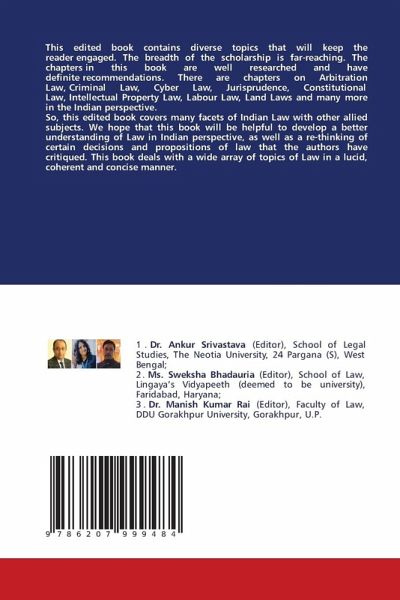 This edited book contains diverse topics that will keep the reader engaged. The breadth of the scholarship is far-reaching. The chapters in this book are well researched and have definite recommendations. There are chapters on Arbitration Law, Criminal Law, Cyber Law, Jurisprudence, Constitutional Law, Intellectual Property Law, Labour Law, Land Laws and many more in the Indian perspective.So, this edited book covers many facets of Indian Law with other allied subjects. We hope that this book will be helpful to develop a better understanding of Law in Indian perspective, as well as a re-thinking of certain decisions and propositions of law that the authors have critiqued. This book deals with a wide array of topics of Law in a lucid, coherent and concise manner.