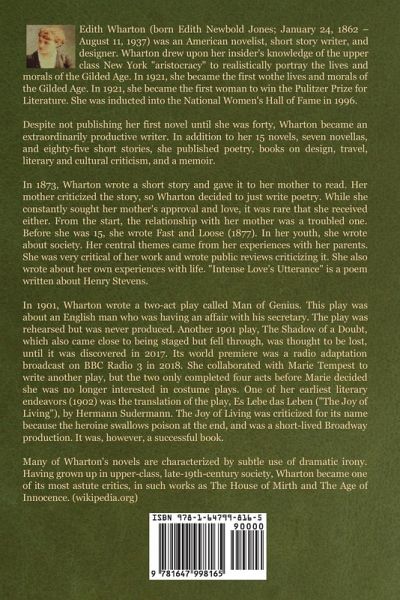Edith Wharton (born Edith Newbold Jones; January 24, 1862 - August 11, 1937) was an American novelist, short story writer, and designer. Wharton drew upon her insider's knowledge of the upper class New York "aristocracy" to realistically portray the lives and morals of the Gilded Age. In 1921, she became the first woman to win the Pulitzer Prize for Literature. She was inducted into the National Women's Hall of Fame in 1996. Despite not publishing her first novel until she was forty, Wharton became an extraordinarily productive writer. In addition to her 15 novels, seven novellas, and eighty-five short stories, she published poetry, books on design, travel, literary and cultural criticism, and a memoir. In 1873, Wharton wrote a short story and gave it to her mother to read. Her mother criticized the story, so Wharton decided to just write poetry. While she constantly sought her mother's approval and love, it was rare that she received either. From the start, the relationship with her mother was a troubled one. Before she was 15, she wrote Fast and Loose (1877). In her youth, she wrote about society. Her central themes came from her experiences with her parents. She was very critical of her work and wrote public reviews criticizing it. She also wrote about her own experiences with life. "Intense Love's Utterance" is a poem written about Henry Stevens. In 1901, Wharton wrote a two-act play called Man of Genius. This play was about an English man who was having an affair with his secretary. The play was rehearsed but was never produced. Another 1901 play, The Shadow of a Doubt, which also came close to being staged but fell through, was thought to be lost, until it was discovered in 2017. Its world premiere was a radio adaptation broadcast on BBC Radio 3 in 2018. She collaborated with Marie Tempest to write another play, but the two only completed four acts before Marie decided she was no longer interested in costume plays. One of her earliest literary endeavors (1902) was the translation of the play, Es Lebe das Leben ("The Joy of Living"), by Hermann Sudermann. The Joy of Living was criticized for its name because the heroine swallows poison at the end, and was a short-lived Broadway production. It was, however, a successful book. Many of Wharton's novels are characterized by subtle use of dramatic irony. Having grown up in upper-class, late-19th-century society, Wharton became one of its most astute critics, in such works as The House of Mirth and The Age of Innocence. (wikipedia.org)