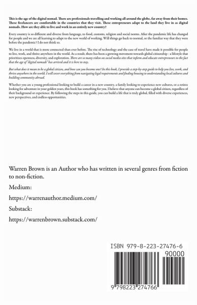 This is the age of the digital nomad. There are professionals travelling and working all around the globe, far away from their homes. These freelancers are comfortable in the countries that they visit. These entrepreneurs adapt to the land they live in as digital nomads. How are they able to live and work in an entirely new country? Every country is so different and diverse from language, to food, customs, religion and social norms. After the pandemic life has changed for people and we are all learning to adapt to the new world of working. Will things go back to normal, or the familiar way that they were before the pandemic? I do not think so. We live in a world that is more connected than ever before. The rise of technology and the ease of travel have made it possible for people to live, work, and thrive anywhere in the world. As a result, there has been a growing movement towards global citizenship - a lifestyle that prioritizes openness, diversity, and exploration. There are so many videos on social media sites that inform and educate entrepreneurs to the fact that the age of "digital nomads" has arrived and it is here to stay. But what does it mean to be a global citizen, and how can you become one? In this book, I provide a step-by-step guide to help you live, work, and thrive anywhere in the world. I will cover everything from navigating legal requirements and finding housing to understanding local cultures and building community abroad. Whether you are a young professional looking to build a career in a new country, a family looking to experience new cultures, or a retiree looking for adventure in your golden years, this book has something for you. I believe that anyone can become a global citizen, regardless of their background or experience. By following the steps in this guide, you can build a life that is truly global, filled with diverse experiences, new perspectives, and endless opportunities.