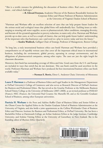 Laura P. Hartman is a Professor of Business Ethics and Legal Studies in the Management Department at DePaul University's College of Commerce and also serves as Research Director of DePaul's Institute for Business and Professional Ethics. She has served as the Gourlay Professor at the Melbourne Business School/Trinity College at the University of Melbourne (2007-2008), as an invited professor at INSEAD (France), HEC (France), the Université Paul Cezanne Aix Marseille III and at the Grenoble Graduate School of Business, among other European universities. Patricia H. Werhane is the Peter and Adeline Ruffin Chair of Business Ethics and Senior Fellow at the Olsson Center for Applied Ethics in the Darden Graduate School of Business Administration at the University of Virginia and also hold a joint appointment as the Callista Wicklander Chair of Business Ethics and Director, Institute for Business and Professional Ethics, at DePaul University. She has been a Rockefeller Fellow at Dartmouth College, an Arthur Andersen Fellow at the Judge Institute, Cambridge University, and Erskine Visiting Fellow at the University of Canterbury in New Zealand. She is the founding editor of Business Ethics Quarterly.