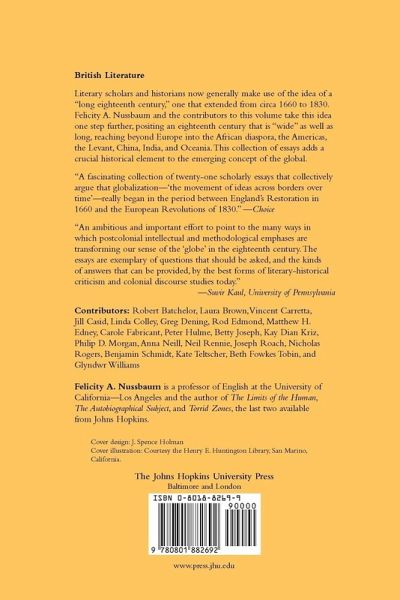 Historians have generally come to accept the idea of a "long eighteenth century," one that extended from circa 1660 to 1830. In The Global Eighteenth Century, editor Felicity Nussbaum and the contributing authors take this idea one step further, positing an eighteenth century that is "wide" as well as long, reaching beyond Europe into the African diaspora, the Americas, the Levant, China, India, and Oceania. Showcasing the work of twenty-one leading scholars in literature, world history, art history, geography, and environmental studies, this collection of essays explores both the literal and the metaphorical crossings of the globe, addressing the cultural significance of maps, paintings, travel writing, tourist manuals, cultural identities, island gardens, and other topics in order to lend insight to our perception of global culture during this time. In addition, the contributors examine the tension between the tendency toward homogenization at the global level and the specifics of local knowledge and culture, analyzing examples of sexual and racial intermingling, the European reception of indigenous knowledge, encounters with diverse religions, the exchange of goods and diseases, and the real and imagined mappings of the world. These essays, which the introduction considers within global and imperial studies, add a crucial historical element to the emerging concept of the global. Through careful analysis of texts, images and artifacts, they articulate the truly global nature of relations among the freshly juxtaposed regions, disciplines, and methodologies of this complex era. Contributors: Robert Batchelor, Laura Brown, Vincent Carretta, Jill Casid, Linda Colley, Greg Dening, Rod Edmond, Matthew H. Edney, Carole Fabricant, Peter Hulme, Betty Joseph, Kay Dian Kriz, Philip D. Morgan, Anna Neill, Neil Rennie, Joseph Roach, Nicholas Rogers, Benjamin Schmidt, Kate Teltscher, Beth Fowkes Tobin, and Glyndwr Williams