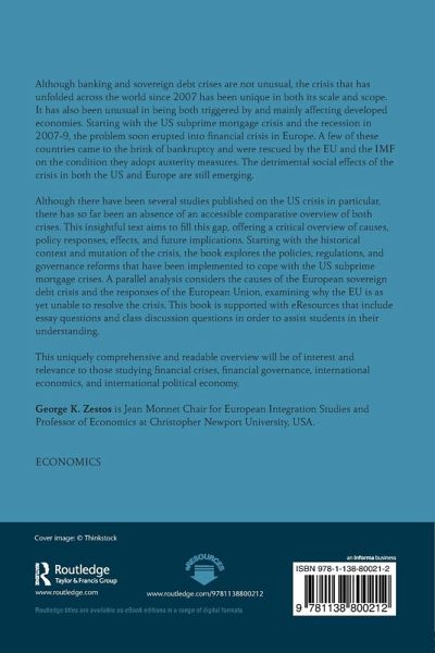 Although banking and sovereign debt crises are not unusual, the crisis that has unfolded across the world since 2007 has been unique in both its scale and scope. It has also been unusual in being both triggered by, and mainly affecting, developed economies. Starting with the US subprime mortgage crisis, and the recession in 2007-2009, the problem soon erupted into financial crisis in Europe. A few of these countries came to the brink of bankruptcy, and were rescued by the EU and the IMF on the condition they adopt austerity measures. The detrimental social effects of the crisis in both the US and Europe are still emerging. Although there have been several studies published on the US crisis in particular, there has so far been an absence of an accessible comparative overview of both crises. This insightful text aims to fill this gap, offering a critical overview of causes, policy responses, effects and future implications. Starting with the historical context and mutation of the crisis, the book explores the policies, regulations, and governance reforms that have been implemented to cope with the US subprime mortgage crisis. A parallel analysis considers the causes of the European sovereign debt crisis and the responses of the European Union (EU), examining why the EU is as yet unable to resolve the crisis. This book is supported with eResources that include essay questions and class discussion questions in order to assist students in their understanding. This uniquely comprehensive and readable overview will be of interest and relevance to those studying financial crises, financial governance, international economics and international political economy.