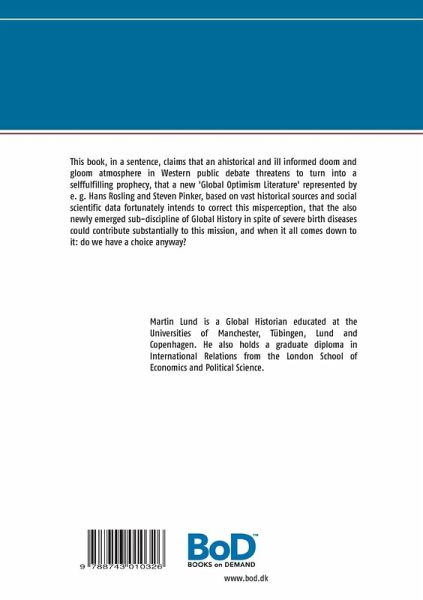 This book, in a sentence, claims that an ahistorical and ill informed doom and gloom atmosphere in Western public debate threatens to turn into a selffulfilling prophecy; that a new 'Global Optimism Literature' represented by e. g. Hans Rosling and Steven Pinker, based on vast historical sources and social scientific data fortunately intends to correct this misperception; that the also newly emerged sub-discipline of Global History in spite of severe birth diseases could contribute substantially to this mission; and when it all comes down to it: do we have a choice anyway?