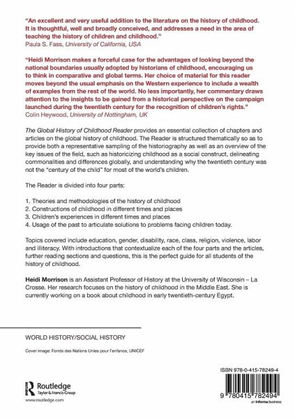 The Global History of Childhood Reader provides an essential collection of chapters and articles on the global history of childhood. The Reader is structured thematically so as to provide both a representative sampling of the historiography as well as an overview of the key issues of the field, such as childhood as a social construct, commonalities and differences globally, and why the twentieth century was not the "century of the child" for most of the world's children. The Reader is divided into four parts: Theories and methodologies of the history of childhood Constructions of childhood in different times and places Children's experiences in different times and places Usage of the past to articulate solutions to problems facing children today. Topics covered include theories and methodologies in the global history of childhood, sources for writing a global history of childhood, education, gender, disability, race, class and religion, the individual in history and emotions, violence, labour and illiteracy. With introductions that contextualize each of the four parts and the articles, further reading sections and questions; this is the perfect guide for all students of the history of childhood.