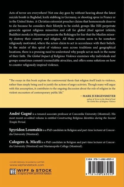 Acts of terror are everywhere! Not one day goes by without hearing about the latest suicide bomb in Baghdad, knife stabbing in Germany, or shooting spree in France or in the United States. A Christian extremist preacher claims that homosexuals deserve to die because he considers their lifestyle to be sinful; groups like ISIS perpetrate genocide against religious minorities and call for global jihad against infidels; Buddhist monks in Myanmar persecute the Rohingya for fear that the Muslim minority destroy their country and religion. All these actions seem to be somehow religiously motivated, where the actors claim to act in accordance with their beliefs. In the midst of this spiral of violence seen across traditions and geographical locations, there is a pressing need to understand why people act as such in the name of their faith. The Global Impact of Religious Violence examines why individuals and groups sometimes commit irremediable atrocities, and offers some solutions on how to counter religiously inspired violence.