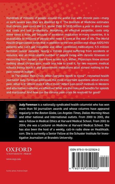 Hundreds of millions around the world live in chronic pain - many in such severe pain they are disabled by it. The Institute of Medicine estimates that chronic pain costs the U.S. alone $560 to $635 billion a year in direct medical costs and lost productivity. Morphine, an effective painkiller, costs only three cents a dose, yet because of excessive regulation in many countries, it is unavailable to millions of people who need it, even at the end of life. The World Health Organization notes that in addition to the one million end-stage AIDS/HIV patients who can't get morphine and other controlled medications, 5.5 million terminal cancer patients, nearly a million people suffering from accidents or violence, and an incalculable number of people living with chronic illnesses and recovering from surgery can't get it, either. Women, children, older people, and the poor are disproportionally affected by inadequate pain relief. Physicians know almost nothing about chronic pain, much less how to treat it, for two reasons: medical schools barely teach it and government institutions allot almost nothing to the pain research budget. In The Global Pain Crisis: What Everyone Needs to Know®, renowned health journalist Judy Foreman addresses the most important questions about chronic pain: what is it, who does it affect most, what works and what doesn't for pain relief in Western and alternative medicines, what are the risks and benefits for opioids and marijuana, and how can the chronic pain crisis be resolved for good? Foreman's book is a wake-up call for a health problem that affects all people across the globe, at all stages of life. Written in the classic, easy-to-read and quick reference style of the What Everyone Needs to Know® series, The Global Pain Crisis is a must for anyone whose life or work is affected by chronic pain.