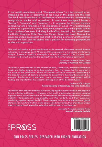 In our rapidly globalising world, "the global scholar" is a key concept for reimagining the roles of academics at the nexus of the global and the local. This book critically explores the implications of the concept for understanding postgraduate studies and supervision. It uses three conceptual lenses - "horizon", "currency" and "trajectory" - to organise the thirteen chapters, concluding with a reflection on the implications of Covid-19 for postgraduate studies and supervision. Authors bring their perspectives on the global scholar from a variety of contexts, including South Africa, Australia, the United States, the United Kingdom, Chile, Germany, Cyprus, Kenya and Israel. They explore issues around policy, research and practice, sharing a concern with the relation between the local and the global, and a passion for advancing postgraduate studies and supervision.