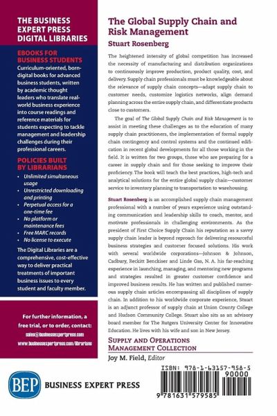 The heightened intensity of global competition has increased the necessity of manufacturing and distribution organizations to continuously improve production, product quality, cost, and delivery. Supply chain professionals must be knowledgeable about the relevance of supply chain concepts-adapt supply chain to customer needs, customize logistics networks, align demand planning across the entire supply chain, and differentiate products close to customers.The goal of The Global Supply Chain and Risk Management is to assist in meeting these challenges as to the education of many supply chain practitioners, the implementation of formal supply chain contingency and control systems and the continued edification in recent global developments for all those working in the field. It is written for two groups, those who are preparing for a career in supply chain and for those seeking to improve their proficiency. The book will teach the best practices, high-tech and analytical solutions for the entire global supply chain-customer service to inventory planning to transportation to warehousing.