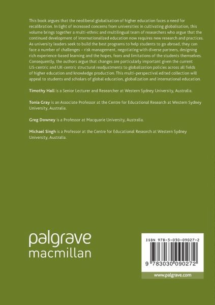 This book argues that the neoliberal globalisation of higher education faces a need for recalibration. In light of increased concerns from universities in cultivating globalisation, this volume brings together a multi-ethnic and multilingual team of researchers who argue that the continued development of internationalized education now requires new research and practices. As university leaders seek to build the best programs to help students to go abroad, they can face a number of challenges - risk management, negotiating with diverse partners, designing rich experience-based learning and the hopes, fears and limitations of the students themselves. Consequently, the authors argue that changes are particularly important given the current US-centric and UK-centric structural readjustments to globalization policies across all fields of higher education and knowledge production. This multi-perspectival edited collection will appeal to students and scholars of global education, globalization and international education.