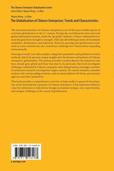 The internationalization of Chinese enterprises is one of the most notable aspects of economic globalization in the 21st century. Despite the 2008 financial crisis and weak global outbound investment, under the "go global" initiative, Chinese outbound investment has gone from strength to strength, while also diversifying in terms of investment modalities, destinations, and industries. However, growing anti-globalization sentiment in some countries has also created new challenges for Chinese firms expanding internationally. Drawing on nearly 3000 data samples, using both quantitative and qualitative research methods, this book presents unique insights into the features and patterns of Chinese enterprises' globalization. The analysis provides a useful reference for enterprises that have already gone global and those that plan to. In particular, this book investigates challenges confronted by Chinese companies when doing business in foreign countries. It summarizes research covering three angles, namely: the current situation, causation analysis and corresponding solutions, and recommendations for firms, government agencies and other institutions. This book provides a comprehensive overview to help readers to grasp the broad picture of the international expansion of Chinese enterprises. It has important reference value for enterprises to help devise foreign investment strategy, seize opportunities, and navigate challenges in the course of globalization.