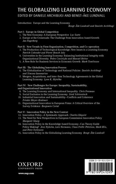 * Introduction: Europe and the Learning Economy * Part One: Europe in Global Competition * 1: The New * Economy: A European Perspective * 2: Jan Fagerberg: Europe at the Crossroads: The Challenge from Innovation-Based Growth * Part Two: New Trends in Firm Organization, Competition, and Cooperation * 3: Patrick Cohendet and Pierre-Benoit Joly: The Production of Technological Knowledge: New Issues in a Learning Economy * 4: Pedro Conceição and Manuel Heitor: Universities in the Learning Economy: Balancing Institutional Integrity with Organizational Diversity * 5: Mark Tomlinson: A New Role for Business Services in Economic Growth * Part Three: The Globalizing Innovation Process * 6: Daniele Archibugi and Simona Iammarino: The Globalization of Technology and National Policies * 7: Lynn K. Mytelka: Mergers, Acquisitions, and Inter-firm Technology Agreements in the Global Learning Economy * Part Four: New Challenges for Europe: Inequality, Sustainability, and Organizational Innovation * 8: Chris Freeman: The Learning Economy and International Inequality * 9: Gerd Schienstock: Social Exclusion in the Learning Economy * 10: Frieder Meyer-Krahmer: Industrial Innovation and Sustainability: Conflicts and Coherence * 11: Benjamin Coriat: Organizational Innovation in European Firms: A Critical Overview of the Survey Evidence * Part Five: Innovation Policy in the New Context * 12: Charles Edquist: Innovation Policy: A Systemic Approach * 13: Margaret Sharp: The Need for New Perspectives in European Commission Innovation Policy * 14: Jens Nyholm, Lars Normann, Clauss Frelle-Petersen, Matk Riis, and Peter Torstensen: Innovation Policy in the Knowledge-Based Economy: Can Theory Guide Policy Making? * 15: Bengt-Ake Lundvall: Innovation Policy in the Globalizing Learning Economy