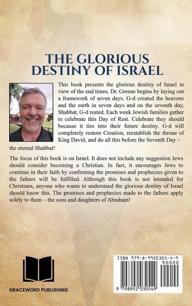 This book presents the glorious destiny of Israel in view of the end times. Dr. Greene begins by laying out a framework of seven days. G-d created the heavens and the earth in seven days and on the seventh day, Shabbat, G-d rested. Each week Jewish families gather to celebrate this Day of Rest. Celebrate they should because it ties into their future destiny. G-d will completely restore Creation, reestablish the throne of King David, and do all this before the Seventh Day - the eternal Shabbat!The focus of this book is on Israel. It does not include any suggestion Jews should consider becoming a Christian. In fact, it encourages Jews to continue in their faith by confirming the promises and prophecies given to the fathers will be fulfilled. Although this book is not intended for Christians, anyone who wants to understand the glorious destiny of Israel should know this. The promises and prophecies made to the fathers apply solely to them - the sons and daughters of Abraham!