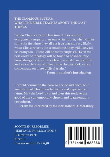 The Glorious Future is about the Biblical doctrine of the Last Things. It concerns prophetic truths from both the Old Testament and the New Testament which shed light on the rule of Christ in history and of His coming again at the end of the world. In that connection it deals with the implications of death, judgment, heaven and hell. The author provides a brief interpretation of the book of Revelation and addresses the question of the nature of the Millennium and its significance. This is a brief but lucid study of Biblical teaching which brings out the practical and spiritual importance of readiness for death and the coming again of the Lord Jesus Christ.