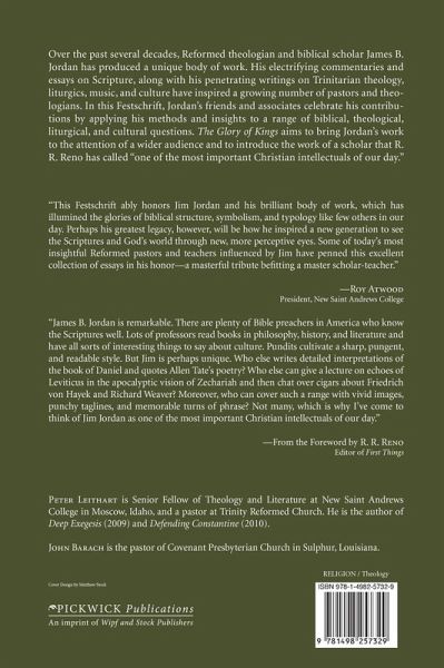 Over the past several decades, Reformed theologian and biblical scholar James B. Jordan has produced a unique body of work. His electrifying commentaries and essays on Scripture, along with his penetrating writings on Trinitarian theology, liturgics, music, and culture have inspired a growing number of pastors and theologians. In this Festschrift, Jordan's friends and associates celebrate his contributions by applying his methods and insights to a range of biblical, theological, liturgical, and cultural questions. The Glory of Kings aims to bring Jordan's work to the attention of a wider audience and to introduce the work of a scholar that R. R. Reno has called "one of the most important Christian intellectuals of our day."