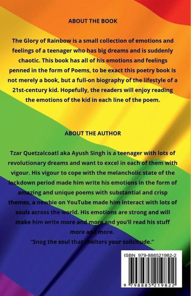The Glory of Rainbow is a small collection of emotions and feelings of a teenager who has big dreams and is suddenly chaotic. This book has all of his emotions and feelings penned in the form of Poems, to be exact this poetry book is not merely a book, but a full-on biography of the lifestyle of a 21st-century kid. Hopefully, the readers will enjoy reading the emotions of the kid in each line of the poem.
