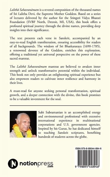 Lalitha Sahasranamam is a revered composition of the thousand names of Sri Lalitha Devi, the Supreme Mother Goddess. Based on a series of lectures delivered by the author for the Sringeri Vidya Bharati Foundation (SVBF North, Detroit, MI, USA), this book offers a profound spiritual journey through the divine names, providing deep insights into their significance. The text presents each verse in Sanskrit, accompanied by an easy-to-read English transliteration, ensuring accessibility for readers of all backgrounds. The wisdom of Sri Bhaskararaya (1690-1785), a renowned devotee of the Goddess, enriches this exploration, offering a traditional yet universal perspective on the power of these sacred mantras. The Lalitha Sahasranamam mantras are believed to awaken inner strength and unlock transformative potential within the individual. This book not only provides an enlightening spiritual experience but also empowers readers to cultivate inner resilience and harmony in their lives. A must-read for anyone seeking personal transformation, spiritual growth, and a deeper connection with the divine, this book promises to be a valuable investment for the soul.