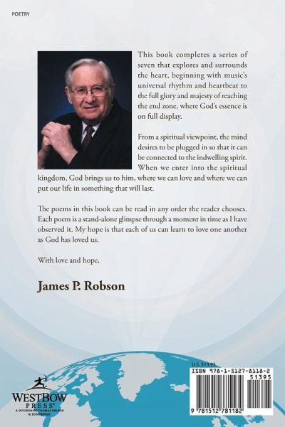This book completes a series of seven that explores and surrounds the heart, beginning with music's universal rhythm and heartbeat to the full glory and majesty of reaching the end zone, where God's essence is on full display. From a spiritual viewpoint, the mind desires to be plugged in so that it can be connected to the indwelling spirit. When we enter into the spiritual kingdom, God brings us to him, where we can love and where we can put our life in something that will last. The poems in this book can be read in any order the reader chooses. Each poem is a stand-alone glimpse through a moment in time as I have observed it. My hope is that each of us can learn to love one another as God has loved us. With love and hope, James P. Robson