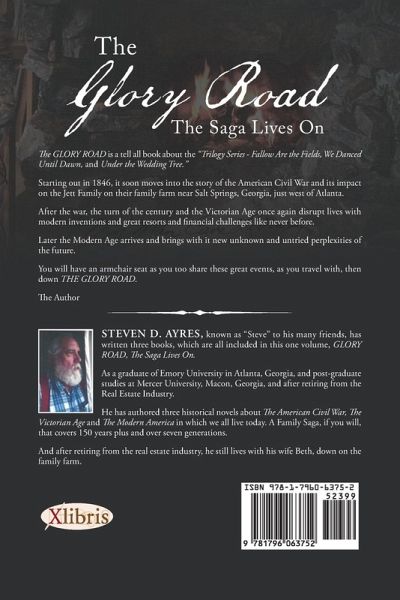 Steven D. Ayres, known as "Steve" to his many friends, has written three books, which are all included in this one volume, GLORY ROAD, The Saga Lives On. As a graduate of Emory University in Atlanta, Georgia, and post-graduate studies at Mercer University, Macon, Georgia, and after retiring from the Real Estate Industry. He has authored three historical novels about The American Civil War, The Veteran Age and The Modern American in which we all live today. A Family Saga, if you will, that covers 150 years plus and over seven generations. And after retiring from the real estate industry, he still lives with his wife Beth, down on the family farm.