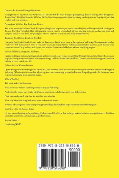 Discover the Secret to Unstoppable Success Feeling burnt out despite all your hard work? It's time to shift the focus from just getting things done to thriving while doing them. Serenity Star's The Glow Formula: Self-Care for Go-Getters is your essential guide to creating a self-care routine that doesn't just relax you but fuels your ambition. Personalized Self-Care That Fuels Your Desires This is not just another self-care book. It's a game-changer that empowers you to take control of your well-being while still chasing your dreams. The Glow Formula is filled with practical tools to create a personalized self-care plan that not only soothes your mind and body but enhances your drive. Say goodbye to burnout and hello to a revitalized, more determined you. Transform Your Habits, Transform Your Life In a world that glorifies hustle, it's easy to forget that success should never come at the expense of well-being. This manuscript teaches you how to shift from constant stress to consistent success. From mindfulness techniques to meditation practices, you'll discover ways to nurture yourself, stay resilient, and elevate your mindset. It's time to find balance without sacrificing progress. Boost Confidence, Energy, and Resilience Imagine waking up each day feeling grounded and empowered, ready to take on anything. Through intentional self-care, this resource helps you strengthen your resilience, reclaim your energy, and build unshakable confidence. This isn't just about feeling good; it's about thriving in every area of your life. Achieve Success Without Burnout Quit running yourself into the ground. With The Glow Formula, you'll learn how to maintain your ambition without sacrificing your well-being. Whether you're focused on advancing your career or reaching personal milestones, this guide provides the clarity and tools to avoid burnout and enjoy sustained success. Who Is This For? This book is ideal for those who: Want to succeed without sacrificing mental or physical well-being Are looking for simple ways to add mindfulness, meditation, and affirmations to your daily routines Need a personal growth plan that fits into their busy schedule Want easy habits that bring both inner peace and outward success Whether advancing your career or improving relationships, this handbook helps you thrive without burning out. Start Your Glow-Up Journey Today It's time to stop hustling and start shining. Embrace mindful self-care that recharges you and enhances your performance. The Glow Formula is your key to a life that feels as good as it looks. Stop surviving; s tart thriving NOW!