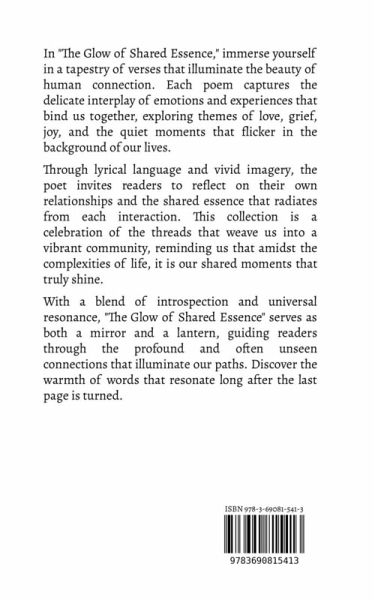 In "The Glow of Shared Essence," immerse yourself in a tapestry of verses that illuminate the beauty of human connection. Each poem captures the delicate interplay of emotions and experiences that bind us together, exploring themes of love, grief, joy, and the quiet moments that flicker in the background of our lives. Through lyrical language and vivid imagery, the poet invites readers to reflect on their own relationships and the shared essence that radiates from each interaction. This collection is a celebration of the threads that weave us into a vibrant community, reminding us that amidst the complexities of life, it is our shared moments that truly shine. With a blend of introspection and universal resonance, "The Glow of Shared Essence" serves as both a mirror and a lantern, guiding readers through the profound and often unseen connections that illuminate our paths. Discover the warmth of words that resonate long after the last page is turned.