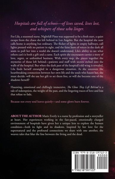 After a traumatic experience at her previous job shatters her life in Los Angeles, ER nurse Lila flees to the small, quiet town of Nightfall Pines, nestled along the Oregon Coast, seeking a fresh start. But her new position at the regional hospital is anything but ordinary. Haunted by mysterious occurrences and drawn into the lives of patients-both living and dead; Lila discovers she has a rare gift that connects her to the spirits bound to the hospital's halls. Each ghost carries a story of heartbreak, unfinished business, and truths waiting to be uncovered. Each haunting clue pulls her deeper into the heart of a mystery buried beneath decades of silence and tragedy at the hospital's old wing. As Lila navigates her connection with the afterlife, she is forced to confront not only their unfinished business but also her own. The ghosts of Nightfall Pines demand her attention, but is Lila ready to face the regrets and burdens she's carried from her own past, or will the glow they left behind consume her entirely? The Glow They Left Behind is a gripping tale of life, death, and the invisible marks we leave on each other. The glow, both literal and symbolic, reflects the lasting impact of lives cut short and the hope that even in death, something beautiful can remain. Perfect for fans of eerie paranormal mysteries, psychological thrillers, and emotional, character-driven stories. This story will linger with you long after you turn the final page.